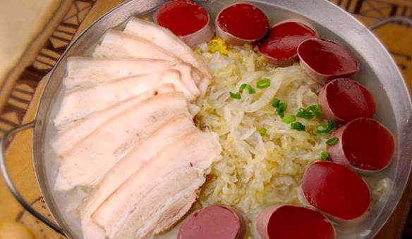 滿族有灌制血腸的習(xí)俗。多在臘月殺豬時制作。用豬血,加鹽、姜、辣椒粉、味精的調(diào)勻,灌入豬小腸之中,所用腸以不足二尺為宜,兩端用細(xì)繩扎牢,血漿不可充的太滿,以免煮時脹裂。煮到一定程度時要用一干凈的鋼針在腸上刺一些針眼,一則排放氣體以免膨脹迸裂,二則掌握火候,一俟沒有血水自針孔洞中滲出,即撈出冷開水或冷水中。食時片成片,可以直接夾食,也可以醮以醬油、醋、蒜泥、姜汁、辣椒油等食用。既鮮美爽口,又多食不膩,佐酒下飯均宜。