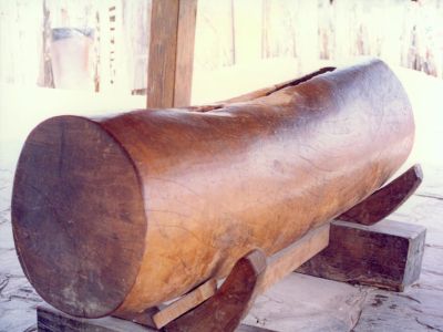 過去,佤族凡新建一個(gè)村寨,就要先找水源定寨址,再拉木鼓蓋木鼓房。佤族認(rèn)為木鼓是天神莫偉的床,木鼓房是莫偉的家,只有拉了木鼓,請莫偉天神進(jìn)寨保佑、才能建房立寨,拉木鼓的日子一般在佤歷一月,即公歷10月進(jìn)行。是時(shí),先由寨子派出有經(jīng)驗(yàn)的老人3—5人進(jìn)山選擇樹木,將選定的樹木每棵劈一點(diǎn)樹皮回來,由魔巴殺雞卜卦,哪棵的卦好就確定為做木鼓的樹,而后由魔巴率領(lǐng)青壯年男子進(jìn)山將樹砍倒,斷出一截做木鼓用。全寨男女老少盛裝艷服將木頭拉回,鑿成木鼓,安放于鼓房內(nèi)。拉木鼓的場面極為熱鬧壯觀,人們以能摸一下拉木鼓的繩索為最大的榮耀。木頭拉到寨外要舉行隆重的剽牛祭神儀式才能將木頭拉進(jìn)寨內(nèi)。木鼓有公母之分,公木鼓用紅毛樹,母木鼓用麻公樹。鼓長1.5-2米,鼓身直徑70—100厘米,一般是扁形和方形。洞深40-50厘米,洞口寬4-5厘米,長1.2-1.4米。洞呈瓜瓢形。背端多有牛頭形浮雕。由于所用本質(zhì)不同,公木鼓發(fā)音高亢清亮,母木鼓沉渾悠揚(yáng),響聲遙遠(yuǎn)。過去,只有逢村寨大事或械斗或集會議事,或祭祀鬼神,或告急友鄰才能敲響木鼓,平時(shí)是不能隨便敲的。由于佤族歷史上有獵人頭祭祀木鼓的習(xí)俗,村寨部落間經(jīng)常發(fā)生血族復(fù)仇的械斗。隨著獵頭陋習(xí)的革除,木鼓已從原始祟拜的氛圍中擺脫出來,成了人們喜愛的敲擊樂器,佤族編創(chuàng)了自娛自樂的木鼓舞。