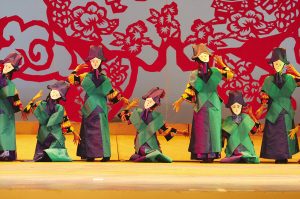 達斡爾族有語言沒有文字,然而在《神奇的達斡爾》演出現(xiàn)場,觀眾卻能夠感受到演員通過聲音和肢體語言記錄下來的活的文字,并且重新思考非物質(zhì)文化遺產(chǎn)的意義所在。近兩個小時的演出,觀眾對達斡爾族的非物質(zhì)文化遺產(chǎn)有了直觀的感受:達斡爾族搖籃,它的制式體現(xiàn)了達斡爾人對生命的思考和對自然的尊重;哈尼卡,達斡爾族傳統(tǒng)的剪紙藝術,伴隨著金色的童年,充實著達斡爾人色彩斑斕的心靈世界;達斡爾族頸力賽,勞動之余一項普及性民間傳統(tǒng)體育競技運動,給人們平常的生活帶來無窮的樂趣——它們,都于2007年被列入第一批內(nèi)蒙古自治區(qū)非物質(zhì)文化遺產(chǎn)保護名錄。不僅如此,曲棍球(達斡爾語為“波依闊”,達斡爾族人喜愛的民間傳統(tǒng)體育項目)、魯日格勒(達斡爾族民間舞蹈,多表現(xiàn)狩獵生活和勞動場面)、烏春(達斡爾族特有的說唱藝術)還被列入第一批國家級非物質(zhì)文化遺產(chǎn)保護名錄。