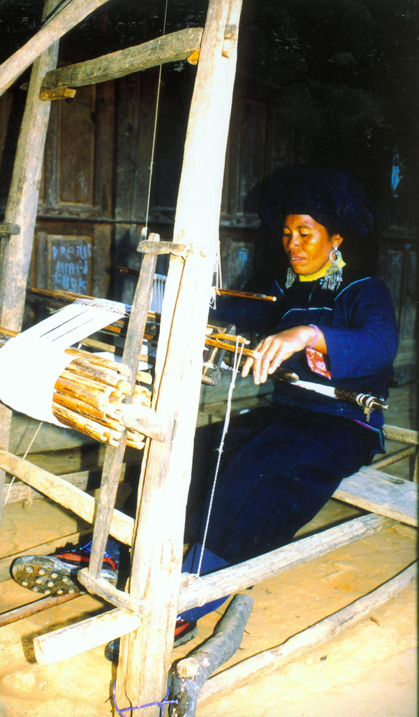 (3)染色。布朗族的印染技術(shù)比較單一,所使用的染色原料是自家栽種的藍(lán)靛和各種野生植物。根據(jù)所需顏色采用不同的植物,如染藍(lán)色取自藍(lán)靛,染黃色取自黃花汁。制作靛墨的程序是用水把藍(lán)靛的葉、莖泡化,撈去渣滓待其沉淀。染布時(shí),再配上一種樹(shù)皮,一起置于鐵鍋熬成藍(lán)汁,然后將白線或白布放入鍋中,反復(fù)熬煮幾次即成藍(lán)線或藍(lán)布。