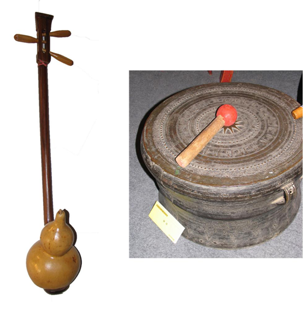 毛南族的歌舞比較簡(jiǎn)單,樂器也不多,主要伴奏樂器有長(zhǎng)鼓(也叫黃泥鼓、祥鼓)、木鼓、手鼓、铓鑼、小銅鑼,另外有時(shí)還用到鈸、木魚和碰鈴,古時(shí)還用嗩吶、簫、笛等(左圖為毛南族葫蘆琴)。