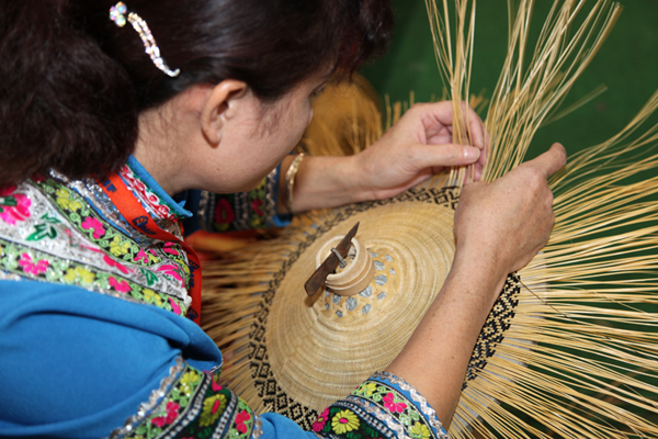 三角鉤鋤是毛南族特有的生產(chǎn)工具,毛南語(yǔ)叫“拱”。它小巧輕便,適合在雞窩地里中耕鋤草,又用于點(diǎn)種黃豆。種黃豆還有一種木制的“點(diǎn)穴錘”,用8寸到1尺長(zhǎng)的金剛木削成圓桿,形如搟面杖,中間插一木柄,手握木柄在泥土里一錘,就成一個(gè)如雞蛋形的坑,即可放入黃豆,蓋上草木灰。這種“點(diǎn)穴錘”一錘一穴,工效很高,是種黃豆的最佳農(nóng)具。此外還有禾剪、割煙刀等(圖為毛南族織錦)。