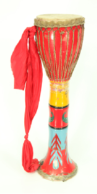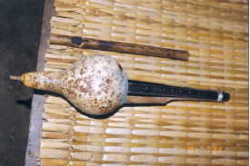 阿昌族的樂器主要有竹琴、洞簫、葫蘆簫(右圖,劉軍攝)、三月簫、銅口弦、三弦、象腳鼓(下圖,蒙哥提供)、铓鑼等。葫蘆簫是用葫蘆連接三根竹管制成的,它有7個音,音量小,音調低緩圓潤,一般晚上用。三月簫用一根竹管制成,也有7個音,它的音量大,音色細亮,多在白天使用。葫蘆簫和三月簫不僅是阿昌族人民心愛的傳統樂器,還是男女青年傳情示愛的媒介。