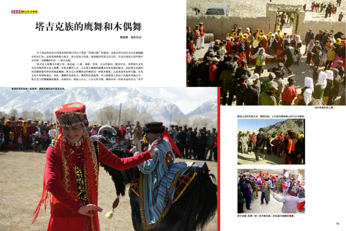 塔吉克人視鷹為百禽之首,是忠誠(chéng)、仁慈、勇敢、堅(jiān)強(qiáng)、正義的象征。勤勞樸實(shí)、有著悠久文化歷史傳統(tǒng)的塔吉克人愛(ài)鷹,自稱(chēng)為鷹的兒女,以在藍(lán)天翱翔的雄鷹為其本民族的象征。因此塔吉克族的民間舞蹈最有特色的就是鷹舞。塔吉克人將鷹的動(dòng)作概括為一種基本舞姿,以此來(lái)表現(xiàn)各種主題,在其文化中有特殊地位。因此,鷹舞的蒼勁有力,鷹笛的優(yōu)美旋律,早已深深溶入到這個(gè)民族的靈魂之中。 塔吉克人的鷹舞舞姿健美、風(fēng)格淳樸,都是八分七、八分九的節(jié)奏。舞蹈中的一些基本動(dòng)作多為“雙手上下擺動(dòng)”、“反背手”等。男子的舞姿為兩臂一前一后,前臂較高,后臂較低,步法矯健靈活,動(dòng)作緩慢時(shí),兩肩微微上下彈 動(dòng),顯示出輕快的心情和豪邁的性格;節(jié)奏急促時(shí),盤(pán)旋俯仰 如雄鷹起落,剛健有力。女子起舞時(shí),雙手隨鼓點(diǎn)在頭顱上部向里、向外旋轉(zhuǎn),舞姿比男子柔和,亦很矯健,步法則根據(jù)樂(lè)曲的節(jié)奏隨意變化,伴奏的樂(lè)器有手鼓和鷹笛兩種,但當(dāng)眾人舞到高 潮時(shí)會(huì)不斷地插入許多口哨、擊掌和歡呼的聲音,氣氛更加熱烈歡騰。在鷹笛和手鼓的伴奏下,舞者從雙腳、腰肩、眼睛、眉 毛、嘴唇都隨著悠揚(yáng)節(jié)奏形成了完整的舞蹈結(jié)構(gòu)。舞者根據(jù)自己 的個(gè)性、年齡跳著不同的舞姿,各種舞姿構(gòu)成了鷹舞最美的景觀,也是帕米爾最亮麗的風(fēng)景線。