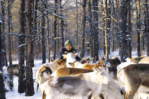 人類馴養(yǎng)馴鹿的歷史有1000多年。這是一種異常勇敢的生靈,生活在北極圈附近,分布在歐亞和北美大陸及一些大型島嶼。在極度惡劣的自然條件下,馴鹿為了繁育后代,每年都要冒著生命危險長途跋涉數(shù)百里,其堅韌不拔的意志力和不屈不撓的品格正是北極冰原精神的象征。在中國,馴鹿棲息在大興安嶺北段的寒溫帶針葉林中,處于半野生狀態(tài),這里有激流河、阿穆爾河、阿巴河、呼瑪河,有阿龍山、奧克里堆山等。食物主要是苔蘚,也吃石蕊、蘑菇及大木植物的嫩枝葉。鄂溫克族的祖先把鹿視為圣潔,賦予其許多美麗的神話和傳說。是啊,只要有了馴鹿,鄂溫克人便是幸福的。據(jù)考證, 我國的馴鹿與貝加爾湖東北部尼布楚河上游溫多苔原高地的馴鹿有淵源關(guān)系??梢哉f,鄂溫克人的馴鹿、狩獵、樺皮文化、薩滿教把北極文化延伸到了興安嶺。