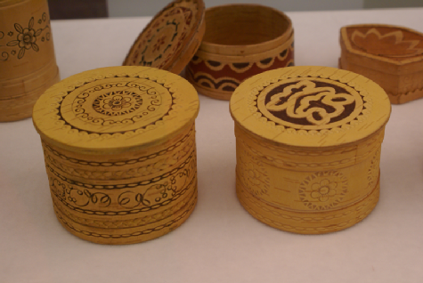 鄂溫克族的雕刻包括骨刻、木刻與樺樹皮刻。骨刻的工具是鐵制刻刀。骨刻制品一般有筷子、衣扣、板指、使用馴鹿時所用鞍子的配件、縫衣物時為拉緊線而用的拉線棒等,不同的用具上刻有不同的花紋。木刻的工具也是鐵制刻刀。木刻一般多用于神像、刀柄、煙鍋和白樺木制的馴鹿鞍具、背夾上。一般的花紋有“奧豪爾”,這種花紋有勾有彎,仿松樹形狀,有馴鹿不會跑掉的意思。背夾上的花紋則是犭罕 、馴鹿、松鼠、天鵝等。樺樹皮雕的工具用犭罕骨制成的刀,分二、三、四齒幾種。雕刻時,先用小刀或錐子把圖案輕輕畫在樺樹皮上,再用犭罕骨刻刀耐心地刻出花紋圖案。圖案一般有云卷紋、菱形紋、水波紋、花鳥等。用顏料涂上藍、紅色,使圖案呈現(xiàn)出色彩對比和立體感。鄂溫克族樺樹皮制品有盆、碗、盒、桶、箱等多種多樣,其制品本身就是非常古樸風雅的藝術品,再雕刻上各種花紋圖案,倍添精致、美觀。