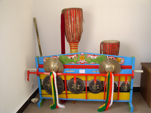 流傳于潞西縣三臺山德昂族的主要聚居區(qū)。鼓身長約三尺,頭寬尾窄,兩頭都蒙有鼓皮。傳說德昂族在大遷徒中,“饒靜”部落是第二批上路的,為了趕上先行的“饒實”部落,鼓手不慎跌了一跤,將鼓砸成兩節(jié)。為了使鼓繼續(xù)發(fā)揮聯(lián)絡、娛樂和鼓舞人心的作用,他用石頭將切口磨平,又蒙上了一張皮。因此,兩面都能發(fā)出與原先的長鼓完全不同的聲音。短鼓舞通常配合象腳鼓舞同時擊打。