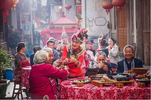 2.畬族婚嫁:婚禮的特色較多。迎親隊(duì)伍到村時(shí),嫁方村上女性拿杉木枝欄路,表示晚上要對歌;到中堂時(shí),嫁方請四位男子與迎親隊(duì)伍中四人相對作揖,此儀式叫“拾田螺”,表示歡迎;中餐由嫁方請迎親隊(duì)伍,媒人就坐中堂席首位,叫“落腳酒”;晚餐由娶方請嫁方親戚朋友,舅公就坐首席,叫請“大酒”;午后,赤郎舉行“借鍋”儀式,赤郎端點(diǎn)紅燭放有一刀肉和兩塊豆腐的米篩向灶神作揖后,用謎語念借所有的炊具,姑嫂們把能藏的炊具都藏起來,念不到就不拿出來,要全部重借,“借鍋”意為娶方借嫁方炊具宴請客人。借好之后,赤郎要?dú)⑷⒎郊姨魜淼囊恢还u用以嫁方“請祖公”,殺雞時(shí),規(guī)定血不許滴到地上,滴一滴地上罰一碗酒;宴席中途嫁方女歌手會(huì)起歌頭找赤郎對歌。畬族婚禮的又一個(gè)特點(diǎn)是,新娘夜行嫁,卯時(shí)進(jìn)夫家門。行嫁時(shí)有牛在前頭踏路,意為新娘一切都要新的,牛踏過的路為新路。以往嫁妝有鋤頭、斗笠、棕衣、線簍、火籠等,體現(xiàn)了畬族婦女熱愛勞動(dòng)。