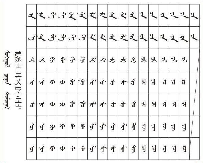 回鶻式蒙古文字是一種拼音文字。字母分元音和輔音兩大類,雖然至今人們尚未在文獻記載中發(fā)現(xiàn)其字母表,但據(jù)后人對這種文字材料進行分析,歸納出有19個字母。其中,5個表示元音,14個表示輔音。書寫時元音字母和輔音字母筆畫連在一起,形成一個整體蒙古字。每個字母視其出現(xiàn)在詞里的位置不同,寫法略有變化,分詞首、詞中、詞末3種變體。阿拼寫時一般以詞為單位,上下連書。字序從上到下,行序從左到右。因其是以回鶻文為基礎(chǔ)創(chuàng)建的,因此稱其為回鶻式蒙古文。