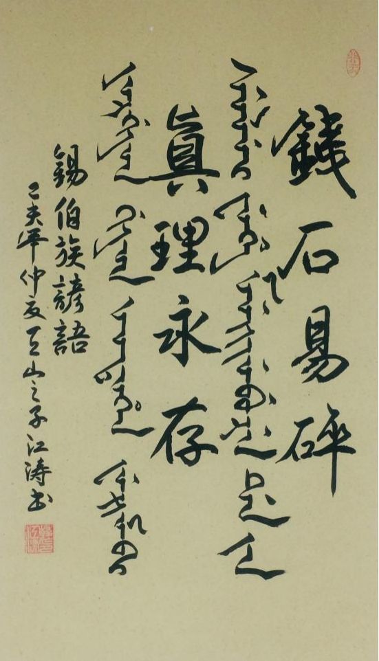 從蒙古文字創(chuàng)立和發(fā)展看,從最初的回鶻人結(jié)合突厥文、粟特文特點創(chuàng)造的回鶻文,到蒙古人在回鶻文基礎(chǔ)上創(chuàng)造的回鶻式蒙古文,再到由梵文、藏文字母演化而成的八思巴字、以及滿族借鑒蒙古文創(chuàng)建的滿文,錫伯族在滿文基礎(chǔ)上改造形成的錫伯文,縱觀其發(fā)展過程,體現(xiàn)了中華各民族文化的特點:即你中有我,我中有你,相互借鑒,又各有特色,共同構(gòu)成了博大精深的中華民族文化。