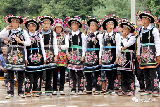 男子頭頂氈帽(又稱氈窩),穿大襟衣、大襠褲,赤足或穿草鞋,披羊皮,外出背皮袋(現(xiàn)已基本消失)。女子裹高包頭、額上飾銀桂花,衣為布襟,外套坎肩,腰系大圍腰,大圍腰左右下三邊繡五色花,為動(dòng)植物圖案,足穿繡花鳳頭鞋,用本地產(chǎn)綠布條制褲子,不鎖腳邊,腰間背圓形白氈裹背,所穿服飾顏色鮮艷、質(zhì)地厚重,盡顯遠(yuǎn)古南詔皇室服飾遺風(fēng)。