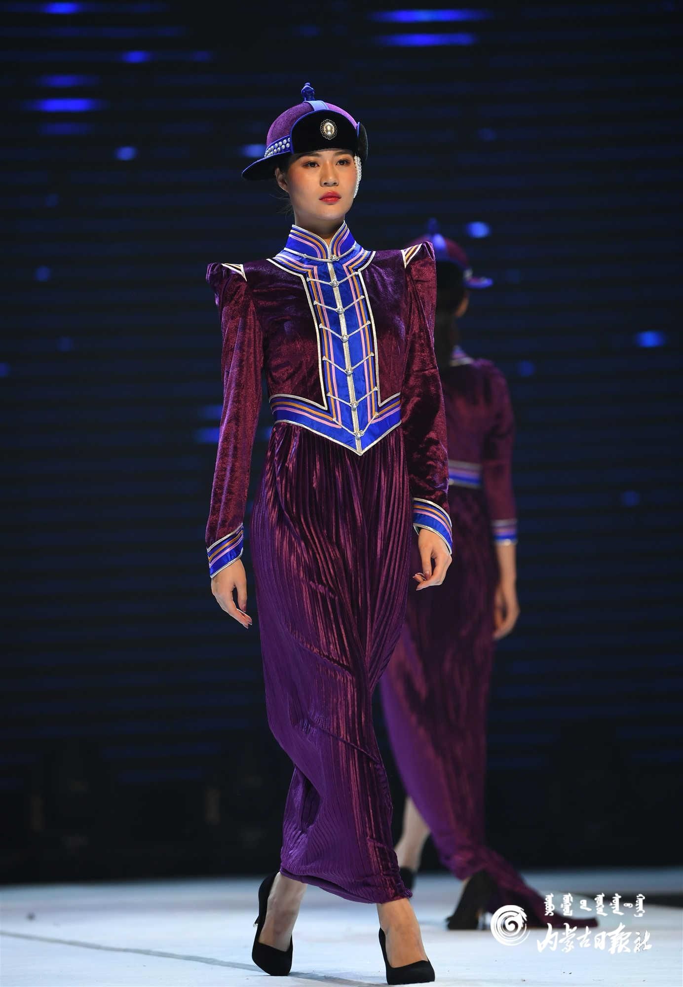 內(nèi)蒙古藝術(shù)學(xué)院的學(xué)生在舞臺上展示蒙古族禮服。