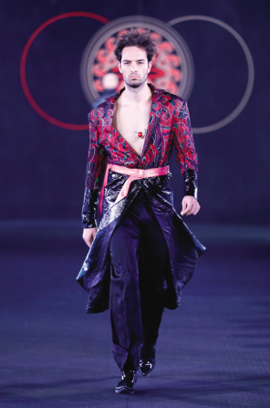 課題組將彝族銀飾經(jīng)典的浮雕圖案元素、彝族畢摩繪畫和文字元素、彝族服飾傳統(tǒng)紋樣圖案元素、彝族鸚嘴帽元素、朵洛荷舞蹈元素、察爾瓦流蘇元素等融入到作品中,沿用傳統(tǒng)民族服裝的色調(diào),并對圖案和造型進行現(xiàn)代設(shè)計和審美的轉(zhuǎn)化與提升,傳統(tǒng)服飾與現(xiàn)代創(chuàng)新設(shè)計相結(jié)合,碰撞出了新的時尚美感。
