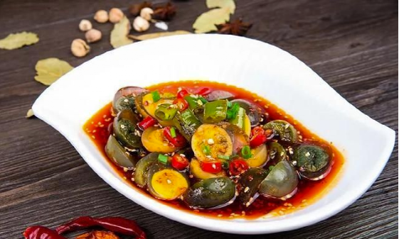 第二就是松花皮蛋。它是用新鮮鴨蛋加工腌制而成的一種生吃食品,因為經(jīng)過了腌制加工,所以蛋清和蛋黃凝固靜皮,剝開不粘蛋殼,且富有彈性,所以簡稱為“皮蛋”。