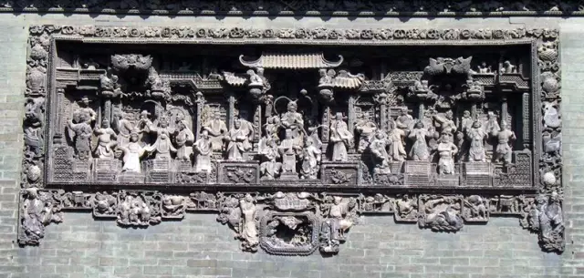 廣東磚雕按技法分淺浮雕、高浮雕和透雕,按規(guī)模分組合磚雕(先單個注模,然后組合成一個完整的圖案)和單塊磚雕。組合磚雕一般用于墻頭、柱頭、照壁等大面積的裝飾,大者需數(shù)百塊磚雕組成。單塊磚雕則常鑲嵌于神龕邊框或相飾、座飾等處。