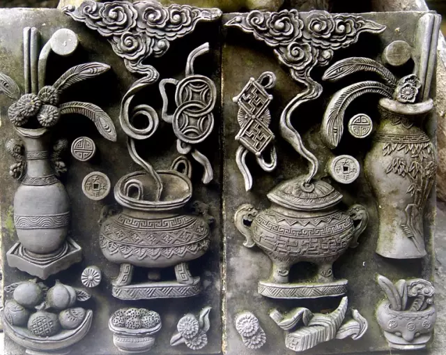 在藝術(shù)上,磚雕遠(yuǎn)近均可觀賞,具有完整的效果。在題材上,磚雕以龍鳳呈祥、和合二仙、劉海戲金蟾、三陽開泰、郭子儀作壽、麒麟送子、獅子滾繡球、松柏、蘭花、竹、山茶、菊花、荷花、鯉魚等寓意吉祥和人們所喜聞樂見的內(nèi)容為主。在雕刻技法上,主要有陰刻(刻劃輪廓,如同繪畫中的勾勒)、壓地隱起的淺浮雕、深浮雕、圓雕、鏤雕、減地平雕(陰線刻劃形象輪廓,并在形象輪廓以外的空地鑿低鏟平)等。民間磚雕從實用和觀賞的角度出發(fā),形象簡練,風(fēng)格渾厚,不盲目追求精巧和纖細(xì),以保持建筑構(gòu)件的堅固,能經(jīng)受日曬和雨淋。