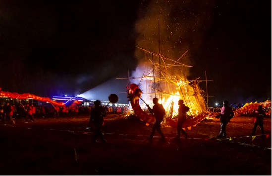 更具特色的要數(shù)正月十五趕毛狗子了。傳說毛狗子(狐貍的俗稱)喜歡偷雞吃,所以必須得趕走。趕毛狗這一天,親朋好友聚在一起,先用竹筒做成火把或用木梓油做成燈備用,再砍樹枝搭成棚子,放入草扎的毛狗子,堆放未破節(jié)的竹筒和火炮樹葉。待天黑,男女老少全部出動,在屋邊及路邊插上點燃的火把、燈,然后燒燃毛狗棚,這邊的人群發(fā)出“哦嗬”聲,那邊的人群高喊“趕毛狗子喲!”此時,滿山遍野火光沖天,叫喊聲此起彼伏,震耳欲聾,熱鬧非凡。