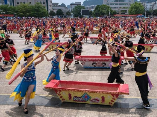 打榔舞,是崇左市天等縣的壯族傳統(tǒng)民俗舞蹈,用于酬神、還愿、祭祀、娛樂(lè)等活動(dòng),起源于唐代武德年間。打榔舞主要道具為木榔,音樂(lè)響起后,每人用一米多長(zhǎng)的木杵有節(jié)奏的敲擊榔壁、榔底和榔邊,動(dòng)作歡快有力,以此來(lái)表達(dá)壯族人民對(duì)五谷豐登、六畜興旺、幸福吉祥的祈求和渴望。表演者不分男女老少,有二人對(duì)打、四人對(duì)打、多人交錯(cuò)對(duì)打等多種方式。