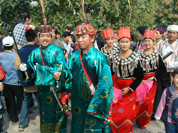 目瑙節(jié):又稱“總戈”,景頗語音譯,意思是“大伙跳舞”。目瑙節(jié)是景頗族最盛大的傳統(tǒng)節(jié)日,一般于每年農(nóng)歷正月十五以后的九天內(nèi)擇雙日舉行,節(jié)期三至五天不等。目瑙作為一種大型的群眾性歌舞活動,由來已久,歷史上,每逢豐年,出征、凱旋、婚姻嫁娶、敬祭鬼神等重要活動,均要跳“目瑙”。景頗族的“目瑙縱歌”原來是一種融宗教和文化習俗為一體的傳統(tǒng)慶典。隨著社會的發(fā)展,逐漸演化為各種不同類別的“目瑙”。大致有以下幾種:①“歲目瑙”,家庭財源茂盛,人丁興旺時舉行;②“布當目瑙”,征戰(zhàn)取得勝利時舉行;③“貢冉目瑙”,同胞兄弟分家自立門戶時舉行;④“騰肯目瑙”,新建房屋住所落成時舉行;⑤“空然目瑙”貴族家娶親辦婚禮時舉行;⑥“達如目瑙”,出征時舉行;⑦“昔目瑙”,有名望的長者去世送葬時舉行;⑧“柱目瑙”,祭奠“木代”神時舉行。不同類別的“目瑙”都有特定的內(nèi)容和表現(xiàn)形式,但有一個共同點就是整個過程都是由“瑙雙”(領舞)隊和“瑙巴”(表演)隊組成的舞隊來表現(xiàn)和完成的。每逢目瑙節(jié)日,村村寨寨的景頗人身著節(jié)日盛裝,紛紛從四面八方涌入目瑙廣場。廣場上人山人海,氣氛熱烈歡快而不失莊嚴古樸的特色。廣場中央高豎著四根長約4米的目瑙柱,亦稱雌雄柱,中間兩根為陰,外面兩根為陽,上面皆繪有精美而富有象征意義的圖案:右邊柱上往往繪以蕨菜花紋,象征團結奮進;左邊常畫回紋構成若干個四方形,并涂以不同顏色,表示景頗族的遷徙路線;中間兩根柱子之間,交叉著兩把長刀,為景頗民族驍勇強悍、堅強剛毅性格的具體標志。目瑙柱的左側立著一個方形架子,上層是吹嗩吶的座位;前面掛著一個兩米長的大皮鼓和一面直徑一米多的大芒鑼,供跳舞時伴奏用。廣場四周用竹籬笆圍起,目的是為了防止野鬼的侵入和牲畜的干擾。舞蹈開始時,鼓樂齊鳴,由兩位德高望重且又熟悉目瑙舞路線的老人身穿大龍袍,頭戴飾有孔雀、野雞羽毛和野豬牙齒的目腦帽,手持長刀領頭,后面跟著背銅炮和持長刀的隊伍,婦女們拿著扇子或彩帕跟在最后,邊歌邊舞,熱鬧非凡。參舞者少則百多人,多則幾千人,從清晨到日暮,以日暮到清晨,通宵達旦,其間舞者跳累時可自動退場小歇片刻,然后繼續(xù)登場舞蹈?!澳胯Эv歌”作為一個民族的傳統(tǒng)活動發(fā)展至今,宗教色彩和類別已日益淡化,它已成為景頗族約定俗成的傳統(tǒng)節(jié)日,統(tǒng)稱為“統(tǒng)肯(傳統(tǒng))目瑙”并賦予了新的內(nèi)涵,其內(nèi)容和形式都是展示一個民族的傳統(tǒng)文化,反映今天的新生活和對未來的美好向往。