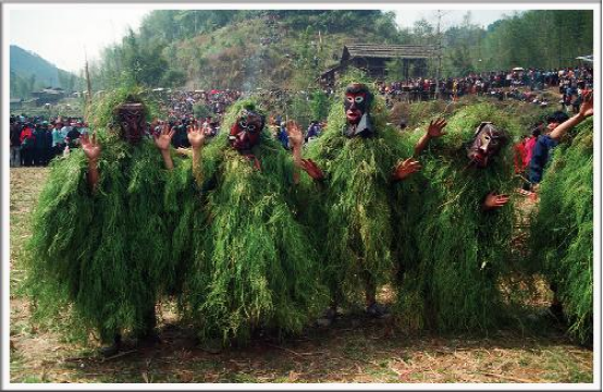 苗族芒篙的固定形象,是面帶古怪的木儺面具,身披齊膝的虎臥藤,手持過頭的竹棍,小腹前掛著長長的象征男性生殖器之物,它們單數(shù)組合,多為11——15個(gè)。