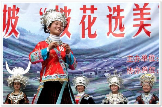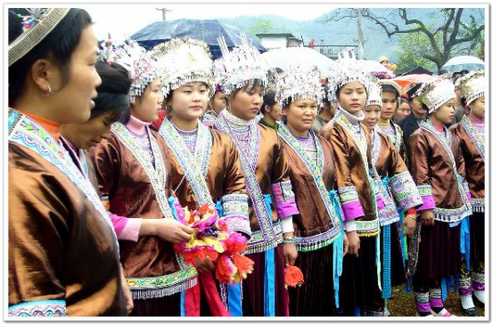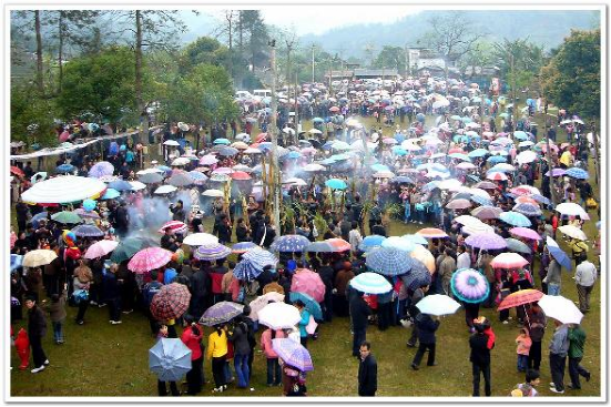 廣西融水縣的香粉古龍坡會(huì)于每年農(nóng)歷正月十六舉行,所以又名“十六”坡。這一天、來自外國朋友、各地的游客及當(dāng)?shù)胤綀A十里的苗哥苗妹,提蘆笙,提鳥籠、牽馬匹,打花傘……朝著十六坡趕來。正午時(shí)分,山梁上、村道間、河溪旁,出現(xiàn)了成列成隊(duì)穿紅戴綠的人群。遠(yuǎn)遠(yuǎn)望去,似一條彩帶在飄動(dòng)。當(dāng)萬余人江集后,整個(gè)坡地就成了彩色的世界。