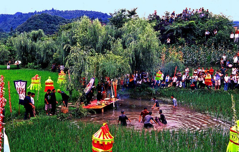 敬霞儀式在霞堂舉行。霞堂設(shè)有祭壇。壇前立著一根竹竿,竿頂上站立一只公雞。祭壇中是主祭席,其友有用松針鋪成十二個(gè)祭祀點(diǎn),由宗族各支系擺設(shè)祭品。敬霞這天,各支系由德高望眾者領(lǐng)隊(duì)。抬著豬肉、糯米飯、米酒等食品列隊(duì)進(jìn)入霞堂。一路上銅鼓、銅鑼、欽、革鼓被敲得冬嚏冬嚓地響,人們跟在后面吆喝著前進(jìn)。祭典開始,鑼鼓暄天。接著由執(zhí)壇的水書先生念讀敬霞的祝詞,內(nèi)容多為祈福禳災(zāi),期冀風(fēng)調(diào)雨順,人壽年豐之類。祝詞之后便酪酒祭之:此后,由兩個(gè)身穿白衣的小伙子抬一母豬到田壩中繞行,后面那位不時(shí)用松針刺戳豬的尾部,使它發(fā)出嗥叫聲。圍觀的人常常發(fā)出哄笑,并且盡情地用竹片屏水和撮稀泥向抬豬者灑淋過去。走過霞堂之后,抬豬者丟下母豬,故意穿進(jìn)圍觀的人群,嚇得人們四處躲避。這種逗趣結(jié)束之后,水書先生再度念讀咒詞,當(dāng)他手中的執(zhí)法彩杖一揮時(shí),飼雞者便學(xué)雞嗚,逗引竹竿頂上的公雞啼鳴。這時(shí),主祭者就向眾人高呼:等待霞神降雨來沐浴。此后,水書先生再念祝詞,又酹酒祭之。然后由各族系代表抬著"酒壇去澆灌"霞神"。人們用酒從頭澆到腳,一直澆到"霞神"們倒(象征酒醉)才算祭祀的成功。