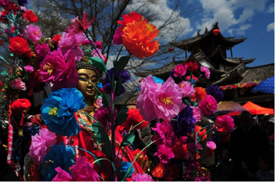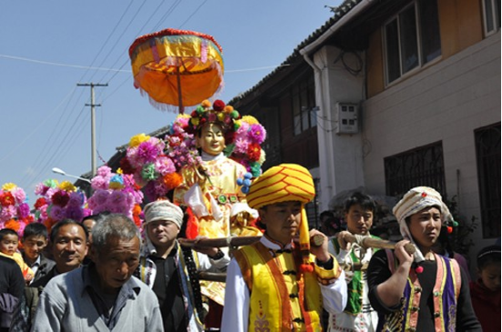 農(nóng)歷二月初六,迎太子入城。這一天在佛教徒的帶領(lǐng)下,人們焚香沐浴,衣冠整齊,虔誠地將“太子”(用布扎油漆制成的太子行像)請到行宮或本主廟里。這一年的新郎為太子抬轎,希望能得到太子的保佑而使新婚的妻子孕生男兒。