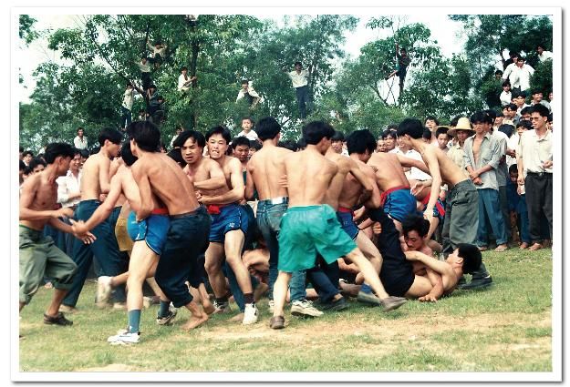 待賀節(jié)隊(duì)回到主會場,花炮節(jié)正式開始,首先是舞獅表演,接著蘆笙、卡羅舞表演,斗馬、斗鳥以及賽馬等活動各自展開。這些活動告一段落后,最精彩的節(jié)目——搶花炮開始了,人們像潮水般涌向主席臺前,圍成一個(gè)幾十個(gè)平方米的空地作搶花炮場地。搶花炮分一、二、三等,搶三次,得勝者,抬著漂亮的花炮頭及獎品興高采烈地回村了。