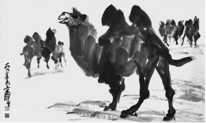 駝隊背負著生活的荷載,承載著最原始的物流,古時候的絲綢之路也是靠駝背馱出來的。浩瀚沙漠,赤地千里,群駝?chuàng)P起高傲的頭,目光炯炯地對抗西北的烈風。人們贊美駱駝,并不是因為它偉岸雄健的身姿,而是它對惡劣環(huán)境那種淡然的態(tài)度,似乎它們與上蒼有個剛直的約定,不懼嚴寒酷暑,不懼路途遙遠,敢與沙塵暴面對面抗衡。它們在行走中鑄就生命的品格,天地之間,駝印曲曲折折,一路向前……