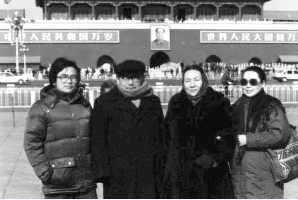 1988年,艾克拜爾(左)和夫人景宜(右)與父母在天安門前合影。