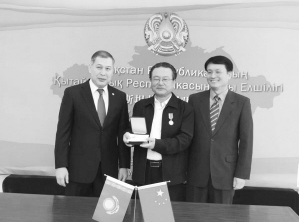 10月17日,艾克拜爾(中)被授予哈薩克斯坦外交部建立外交關(guān)系25周年金質(zhì)獎(jiǎng)?wù)?,哈薩克斯坦駐華大使沙赫拉特·努雷舍夫(左)為其頒發(fā)了獎(jiǎng)?wù)隆?/span>