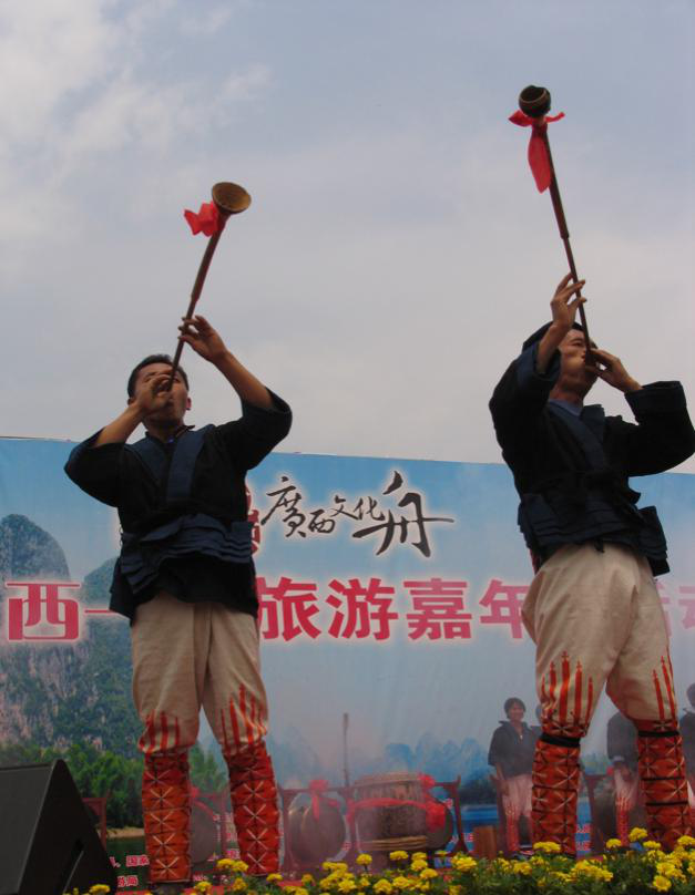 民間娛樂和日常祭祀用的樂器,有長鼓(黃泥鼓)、銅鼓、嗩吶、洞簫、笛子、銅鈴、簡板、長號、牛角、銅鑼和皮鼓等。長鼓、牛角、竹笛等樂器,在宋代的樂器中,已廣泛采用,是十分動聽的一種樂奏。牛角,是瑤族特有的古老樂器,演奏時用以伴奏,其聲“鳴鳴”然,遠近無不聽聞。長號、銅鑼、鈸、二胡等樂器是外族傳入瑤區(qū)的,他們除了吸取外族演奏的技藝之外,根據自己的民族特點,增添了不少的本民族生活色彩,演奏技巧更為高超,深受群眾歡迎。