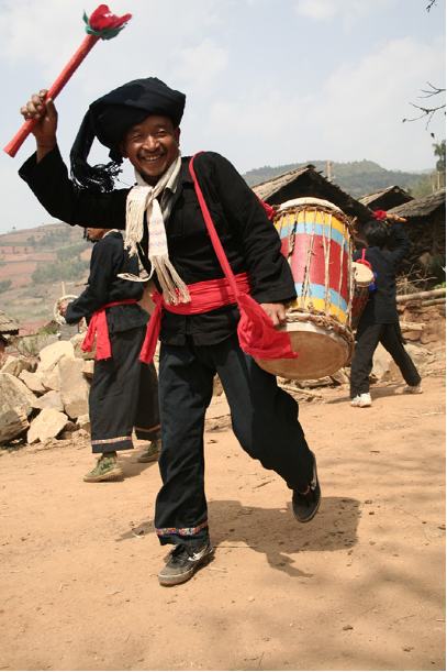 現(xiàn)今的蜂桶鼓直徑一般25—30厘米,高70—80厘米,以攀枝花樹或柳樹挖空樹心,兩端蒙上牛皮制成,形似蜂桶。鼓棒直徑3—4厘米,長40—50厘米,兩端系有彩色布條。