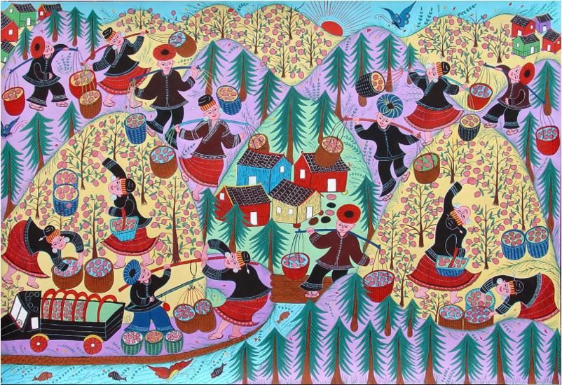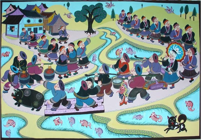 劍河現(xiàn)代民間繪畫(huà)源于傳統(tǒng)的苗族刺繡文化,是苗族刺繡文化的另一種表現(xiàn)形式和藝術(shù)升華。傳統(tǒng)的苗族文化多以服飾、歌舞為載體,并以刺繡及演唱等形式進(jìn)行表現(xiàn)和傳承。早期劍河現(xiàn)代民間畫(huà)即脫胎于具有適用性的苗族刺繡樣稿——剪紙和手繪刺繡粉本,換言之,手繪的苗族刺繡粉本便是劍河現(xiàn)代民間繪畫(huà)的雛形,劍河第一批優(yōu)秀的現(xiàn)代民間畫(huà)作者,即是原當(dāng)?shù)厥掷L粉本的能工巧匠。劍河現(xiàn)代民間繪畫(huà)多以苗族神話(huà)傳說(shuō)中的故事情節(jié)和民俗節(jié)日、生產(chǎn)活動(dòng)等內(nèi)容為題材入畫(huà),素材涵蓋自然界花鳥(niǎo)蟲(chóng)魚(yú)及人物、家畜等具體形象,造型稚拙天真,設(shè)色濃艷,對(duì)比強(qiáng)烈。作品傳達(dá)出典型的地域民俗氣息及濃厚的鄉(xiāng)土味,便是其標(biāo)志性特征。