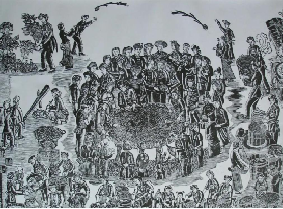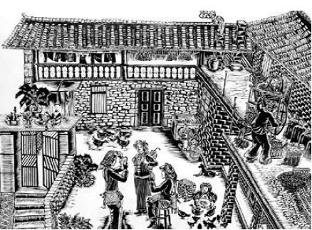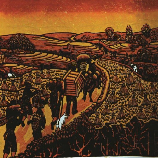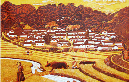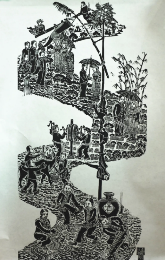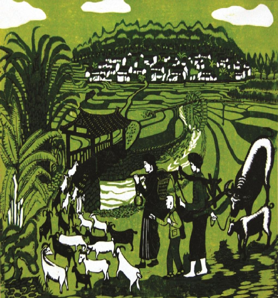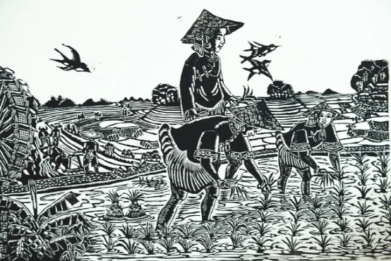 云南馬關(guān)壯族農(nóng)民版畫起源于馬關(guān)縣仁和鎮(zhèn)阿峨新寨村,“以刀代筆”是其主要的藝術(shù)形式,刀法粗獷、豪放而不乏細(xì)膩,具有濃郁的鄉(xiāng)土氣息和深厚的民族文化內(nèi)涵。