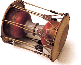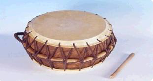 鼓框為木質(zhì),兩面蒙皮,用繩索固定在木框兩邊。鼓鏈木質(zhì),通常在表演中負(fù)責(zé)敲擊主要旋律的重拍,也有獨奏的情況,聲音有力。