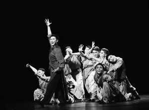 引子部分,板兒聲響,一個(gè)調(diào)皮的男孩偷跑出來(lái)聽(tīng)書(shū),他穿越人墻等待好戲開(kāi)場(chǎng)。此時(shí),說(shuō)書(shū)人突然開(kāi)講,吸引越來(lái)越多的“觀眾”(舞者)紛紛上前,仔細(xì)聆聽(tīng)接下來(lái)發(fā)生的離奇故事。第一段舞蹈以群舞的形式表現(xiàn)人潮逐漸聚集的場(chǎng)景,通過(guò)“側(cè)耳聽(tīng)”和“左右看”這兩個(gè)動(dòng)作,反映出“觀眾”對(duì)于山東快書(shū)的好奇之心。