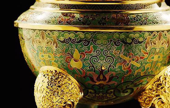 此時的景泰藍不僅繼承了明代豪華、古典、雅致的民族風格,而且鍍金技術(shù)更為發(fā)達,器物表面多飾以珍貴寶石,鍍金厚重光亮,寶石燦爛奪目,二者相得益彰,充分體現(xiàn)了皇家的雍容氣派。