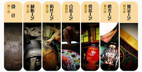 一件景泰藍成品需要歷經(jīng)設(shè)計、制胎、掐絲、點藍、燒藍、磨光、鍍金七大步驟,近百道工序,十幾個工匠三個月的時間純手工方能完成。景泰藍既運用了青銅工藝,又吸收了瓷器工藝,同時大量引進傳統(tǒng)繪畫和雕刻技藝,是集冶金、鑄造、繪畫、窯業(yè)、雕、鏨、錘等多種工藝為一體的復(fù)合性工藝過程,堪稱集中國傳統(tǒng)工藝之大成,因而自古便有“一件景泰藍,十箱官窯器”之說。