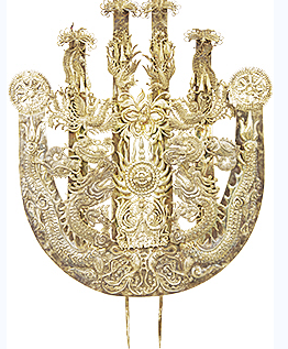 而最為極致的演繹,則要屬黔東南地區(qū)的苗族“盛飾”:黃平苗族的球形銀鳳冠,銀冠之上布滿銀花,蝴蝶、螳螂、雀鳥等動物形象立于花間,一派生機(jī)。銀冠下緣飾有響鈴,行動時搖曳生姿、聲色俱美;雷山西江苗族的大銀角,寬近1米,立高可達(dá)70厘米左右,面上鏨刻有雙龍搶寶的主紋,兩端尖角處可插羽毛或彩線,中央插有一把銀扇,既像鳥羽,又似太陽放射出的光芒……