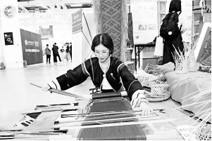 2021年5月,在第六屆全國(guó)大學(xué)生藝術(shù)展演活動(dòng)現(xiàn)場(chǎng),海南師范大學(xué)學(xué)生展示黎族腰織機(jī)織錦技藝。第六屆全國(guó)大學(xué)生藝術(shù)展演活動(dòng)組委會(huì)供圖