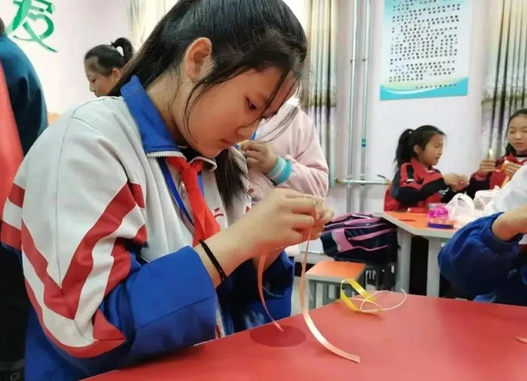 葛玉英說:”芨芨草手工編織品主要有簍、筐、盒、盤、茶墊、時尚包等生活用品,色彩以白、藍為主,圖案以白云紋、曲字紋為主,以針繡法結(jié)合草編中的平編、絞編、編花、纏邊、擰編等技法進行編織。在實際教學(xué)中,為了方便,我用彩帶代替芨芨草,讓芨芨草編織技藝在孩子們的濃厚興趣中得到傳承,既提高了學(xué)生的動手能力,也提升了學(xué)生的審美思維和審美能力,同時增強了學(xué)生對本土文化的自豪感和自信力?!?/p>