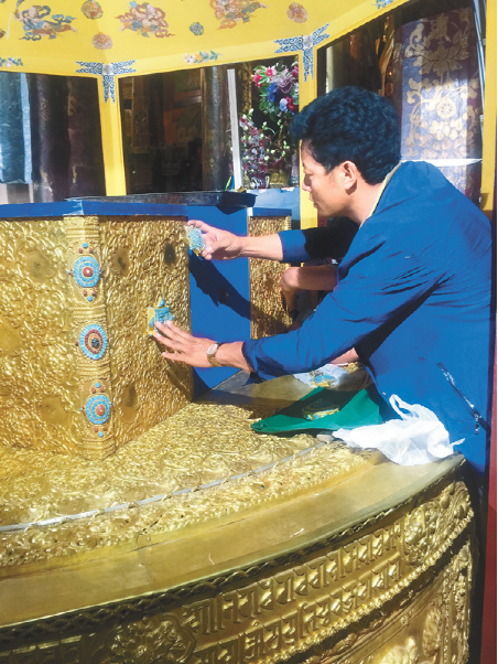 2011年,拉薩大昭寺啟動(dòng)金頂維修工程。次嘎有幸成為此次維修大昭寺金頂、金屬佛像和法器等鍛鑄造任務(wù)的工藝匠人。