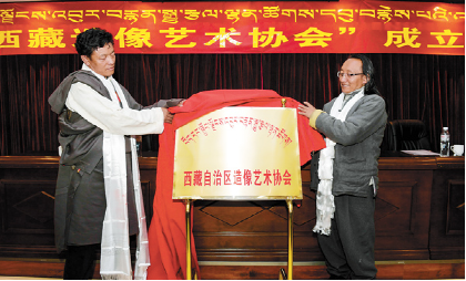 2017年12月3日,西藏造像藝術(shù)協(xié)會(huì)在拉薩成立。 圖為該協(xié)會(huì)會(huì)長(zhǎng)朵普·次嘎(左)與西藏民族藝術(shù)研究所副所長(zhǎng)阿旺丹增共同為協(xié)會(huì)揭牌。