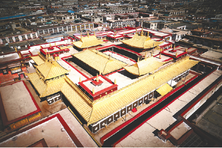 2011年,我區(qū)全面啟動(dòng)大昭寺金頂維修工程,朵普·次嘎積極參與到大昭寺金頂修繕保護(hù)工程當(dāng)中。 圖為大昭寺金碧輝煌的金頂。