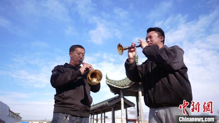 李曉盼(右)在吹奏嗩吶?!黔偂z