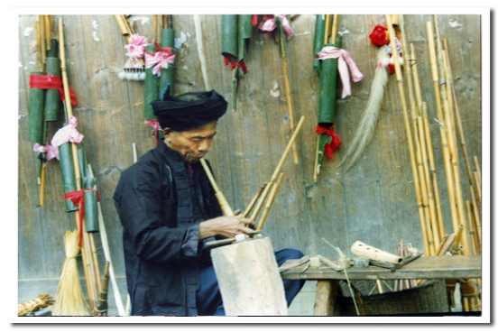 蘆笙由笙斗、笙管、簧片和共鳴筒四個部件構(gòu)成。