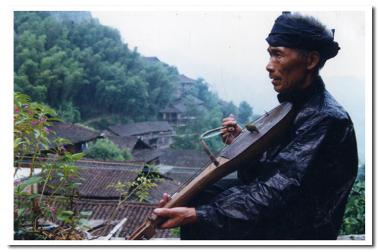 果哈是苗族唯一的古老的民間弓弦樂器,因其形似瓢,故苗語稱之為果哈(意即瓢琴),是唱古歌時不可缺少的伴奏樂器,一般以歌師自拉自唱為主。制作工藝比較粗糙,先選一段長60厘米、直徑為15厘米左右的鴨腳木或泡桐木制成琴身,在其二分之一的一端剜成瓢狀,封住薄板作共鳴箱。另一端修成琴柄,在琴柄頂端鉆孔安琴鈕,用棕繩、牛筋作琴弦,用竹片和綜絲制成弓。琴置兩弦,演奏時以人的唾液代替松香,演奏者時而將弓毛放入口中,讓弓毛增加溫度,增強(qiáng)與琴弦的磨擦,使之發(fā)音。果哈音量微弱,發(fā)音低沉,但音色獨(dú)特,與苗歌語調(diào)相當(dāng)協(xié)調(diào),較適合表現(xiàn)安靜、深沉情緒,故常為苗族敘事古歌伴奏。