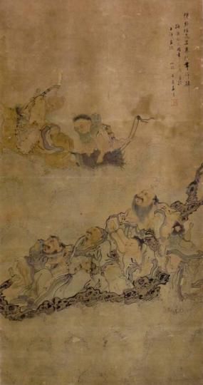 同時,展覽展出的八仙題材作品中,清代王素的《八仙圖》描繪了八仙過海的場景,八仙形象神態(tài)各異;清代蘇仁山的《李凝陽像》,則以墨筆描繪鐵拐李的背面,其身后背有斗笠和巨大的葫蘆,手持拐杖,作品構圖獨特,線條流暢,人物形象簡拙。