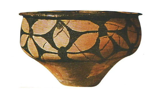 河南三門峽廟底溝遺址出土的仰韶文化中期彩陶花瓣紋盆。(魏興濤 供圖)